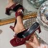 Sandálias Femininas Confortáveis de Salto Baixo e Bico Quadrado, Chinelos Doces de Seda com Laço e Salto Grosso para Senhoras, Calçados de Exterior, Slides Vermelhos, Saltos Vermelhos, Preto