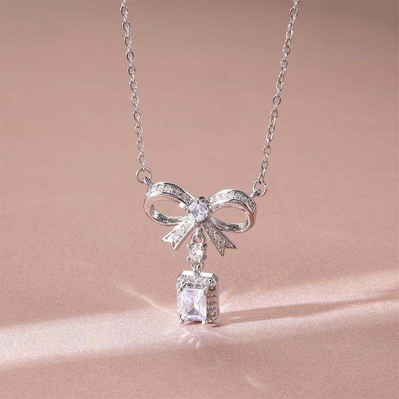 Bow Necklace Women'S Premium Sense Simple Daily Versatile Square Diamond Pendant Delicate Clavicle Chain