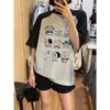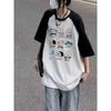 Camiseta de Algodão Puro com Ombro Raglã e Manga Curta Feminina Verão Tamanho Grande Divertida e Moderna Estampada Contrastante Casual