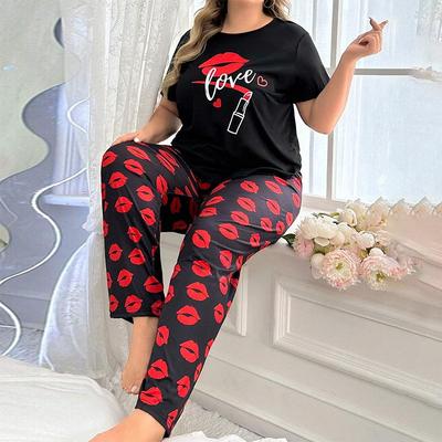 Conjunto de pijama plus size 5XL 6XL para primavera verão com estampa de coração para mulheres, roupa de dormir de duas peças, loungewear, blusa de manga curta e calças, pijama feminino, roupa de casa