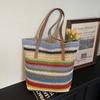 Nova Bolsa de Palha Tecida à Mão com Listras Contrastantes Arco-Íris Casual Versátil Bolsa de Ombro para Férias à Beira-Mar