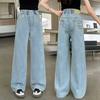 Calças de Menina Primavera e Outono Jeans de Perna Larga Moda Meninas Coreano Bolso Traseiro Calças de Perna Reta