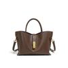 Esta bolsa tem uma silhueta trapezoidal única confeccionada em couro de vaca de camada superior. Apresenta alças de mão curtas, uma alça de ombro longa destacável, uma decoração de fivela dourada e um acabamento texturizado, apresentando um visual elegante e moderno.