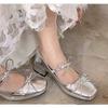 Mary Jane single shoes women's new light mouth square head thick heel ballet shoes silver word with bow high heels