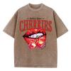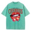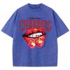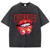 Casual Womens Acid Wash T-Shirts Cherries On The Lips Printing Tees Distressed Oversize Short Sleeve Trend Female Clothes