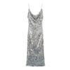 Elevate your wardrobe with this stunning women's midi slip dress, perfect for spring 2025. Crafted from high-quality polyester, this dress features a slim fit that beautifully complements the figure. The captivating sequin embellishments add a touch of glamour, while the draped collar design brings sophistication and elegance to any occasion. Ideal for an evening out or a special event, this dress seamlessly combines style and comfort, making it a must-have addition to your collection.