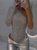 Top sexy de um ombro justo com strass e lantejoulas para garota quente de primavera e verão