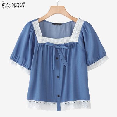 ZANZEA Women Casual Square Neck Summer Short Sleeve Splice Blouse