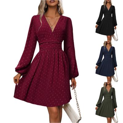 Vestido casual feminino de manga comprida e decote em V, moda outono, linha A, cintura alta, vestido de inverno feminino, elegante, vintage, liso, slim, festa, vestido feminino 25825