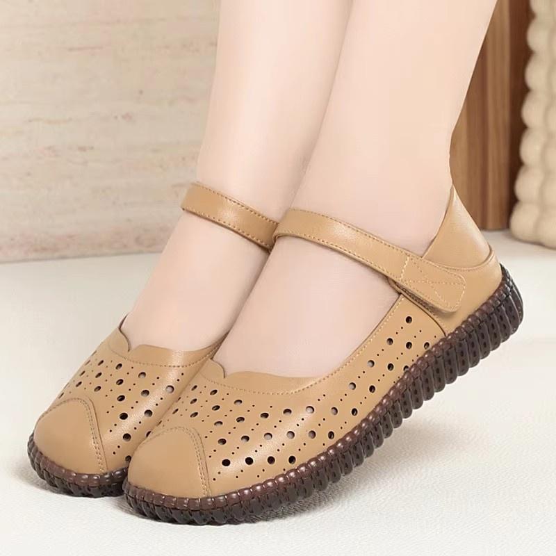 Breathable Comfortable Cutout Hole Shoes Flat Heels Loafers 2025 Summer Genuine Leather Shoes for Office Mom Big Size 41 42