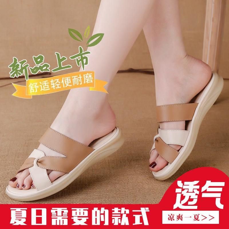 Leather cool slippers women's summer wear flat bottom soft bottom non-slip beef tendon bottom one-word drag