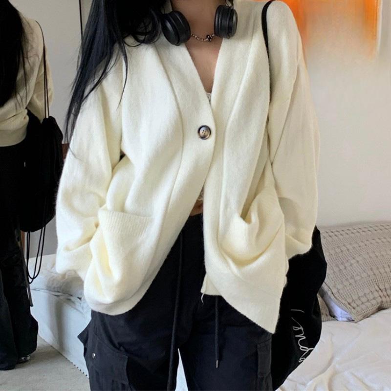Um Cardigan Tricotado de Estilo Coreano Solto e Descontraído para Outono e Inverno Feminino, Um Novo Casaco Suéter Macio e Casual com um Botão