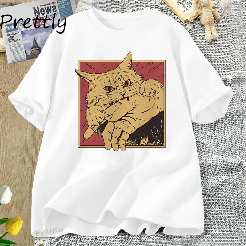 Vintage Cat Bite T Shirt Japanese Horror Retro Graphic Tee Horror Cats Crazy T Shirts Men Women Fashion Short Sleeve Tees