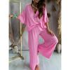 Summer White Two Piece Set for Women V Neck Bat Sleeve Top Casual Loose Lace Up Wide-leg Pants 2 Piece Suit Home Outfits Women's