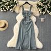 Strap Denim Dress Women's French Style Retro Washed Distressed Single-Breasted Silm Slim Looking Graceful and Fashionable Suspender Dress
