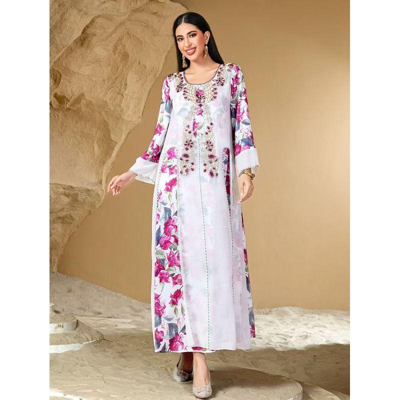 New Middle East Robe Loose Print Handmade Seam Drill Dress Hand Sewn Diamond Dress
