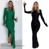 European and American Sexy Split Long Sleeve and Ground Dress round Neck Autumn Winter Women's Wear Long Dress Sexy Split Dress