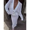 Holiday Style White Knitting Suit Women Seaside Beach Bikinis Strap Waist Hugging Hollow Long sleeve Cover up Skirt