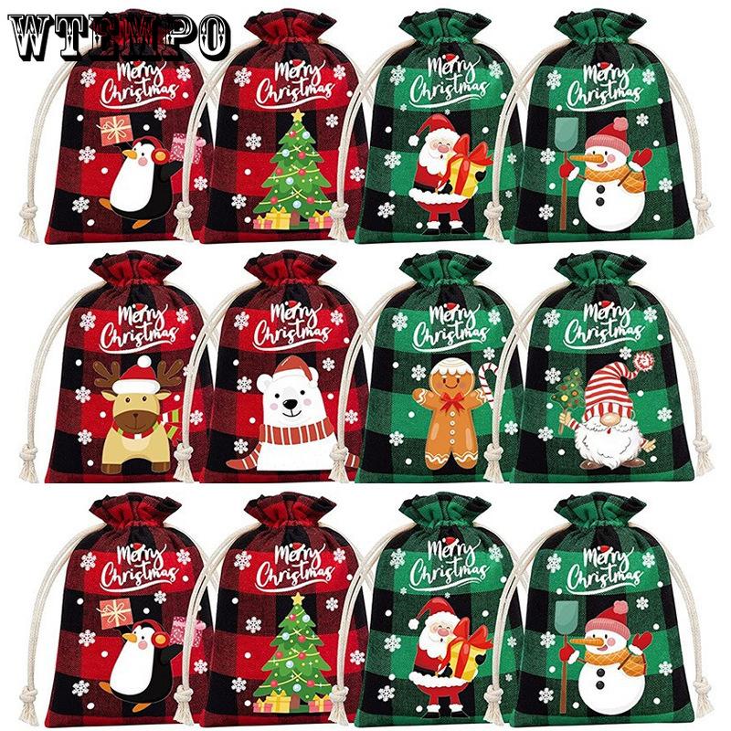 12pcs Christmas Checkered Linen Drawstring Bag Coarse Linen Candy Drawstring Storage Bag Children's Christmas Gift Bag Drawstring Bag