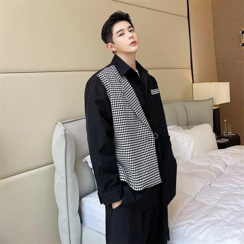This stylish shirt for men features a unique two-piece design with a distinctive suit collar, embodying contemporary Korean fashion trends. Crafted from high-quality bamboo fiber, it ensures comfort and sustainability. The shirt's long sleeves and solid pattern offer a sleek and polished look, making it an excellent choice for niche hairstylists and fashion-forward individuals. The tailored neckline adds a refined touch, perfect for both casual and professional settings.