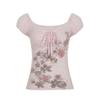 H's European and American Women's Clothing Retro Sweet Plant Florals Print Pink T-shirt Drawstring Lace Low-Cut Short Top