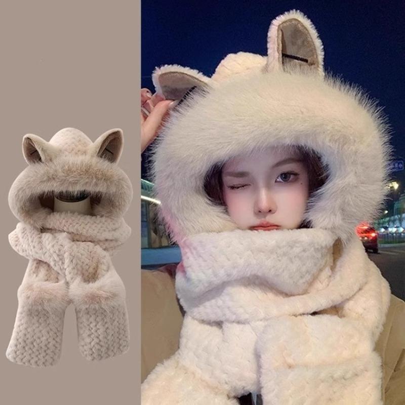Cute Ali hat scarf integrated female winter hooded female ear protector plush warm neck cover winter
