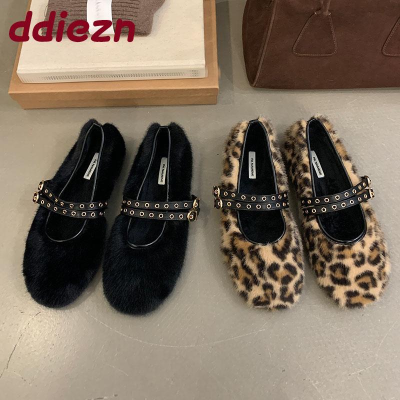 Fashion Fashion Round Toe Women Mary Janes Flats Fur Shoes Female Buckle Strap Footwear Warm Ladies Flats Shallow Shoes