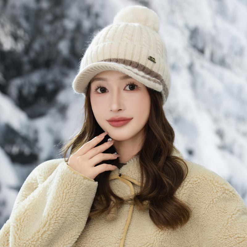 Korean Version of Versatile Wool Ball Plus Velvet Thickened Warm Hat Autumn and Winter Outdoor Leisure Cold-proof Duckball Cap Knitted Wool Cap