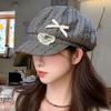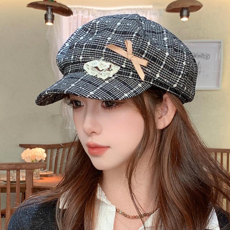 Autumn Retro Flower Plaid Beret Versatile Korean Sweet and Cute Baseball Cap Windproof Octagonal Hat Women's Style