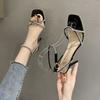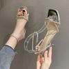 One-word buckle sandals women's 2025 summer new square head beautiful rhinestone straps sexy silver stiletto high heels women