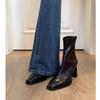 Spot version~ Korean soft leather thick heel square head small short boots retro elastic thin boots women's rear zipper high heel single boots