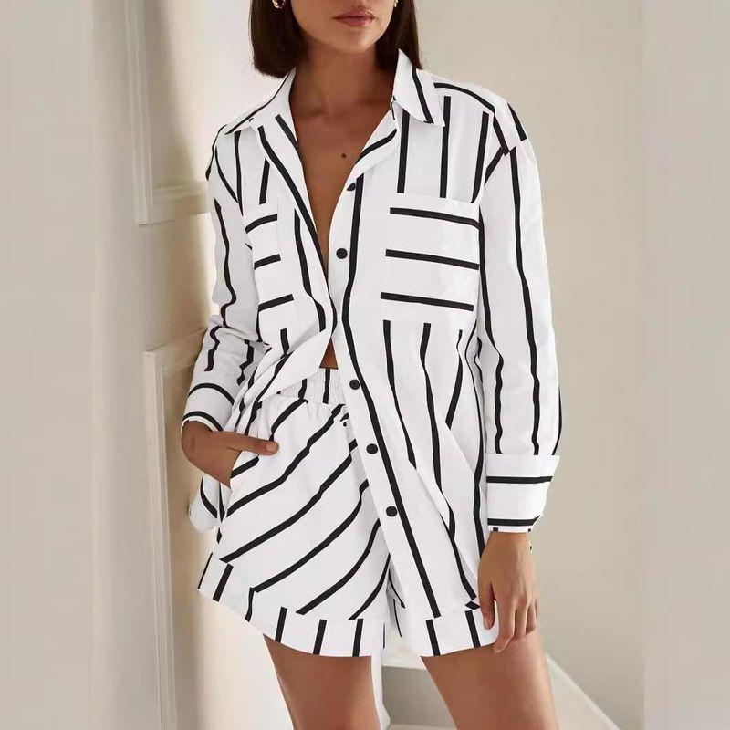 2025 European and American Women Fashion Casual Stripe Contrast Color Patchwork Print Cardigan Shirts Shorts Set