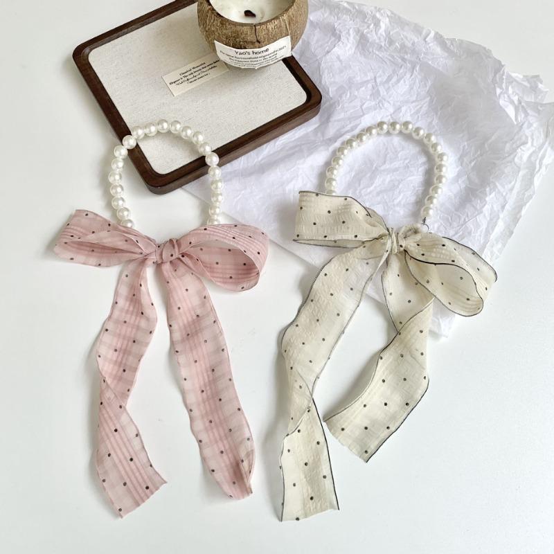 New pearl necklace floral long headband small silk scarf women's spring and summer thin collarbone chain streamer bag decorative scarf