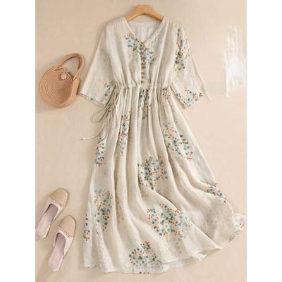 K-style Plus Size Women's Clothing V Neck Vintage Print Lace-up Waist Trimming Ruffles Mid Length Long Length Long Sleeves Dress Trendy Dress