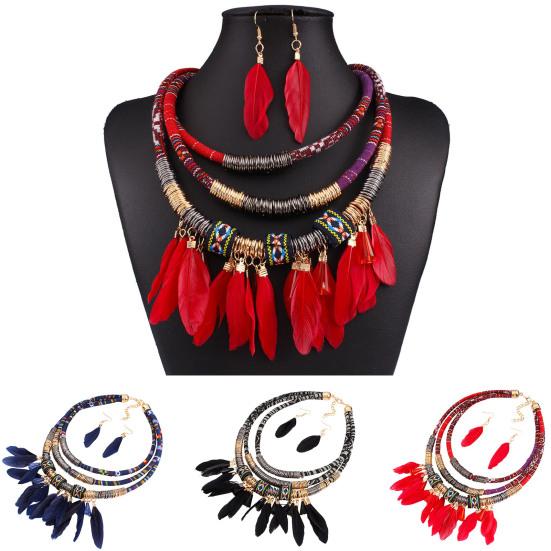With the design of feather tassel, the Bohemian multilayer necklace earrings set stands out among all other ordinary necklaces set.