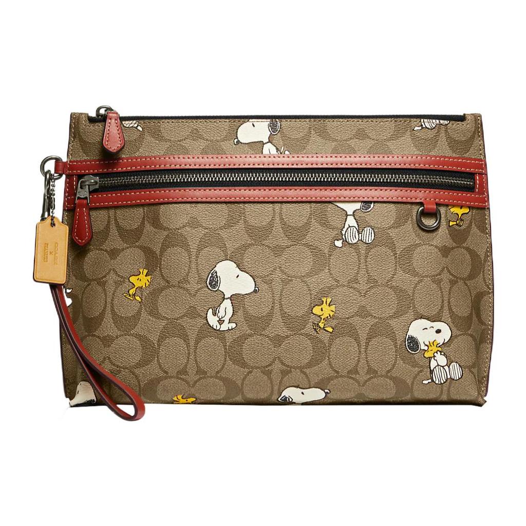 Nova Necessaire Colaboração COACH PEANUTS Lona Revestida Com Couro de Bezerro Refinado Bolsa de Pulso Clutch Grande Feminina Cáqui CE712-QBE7V