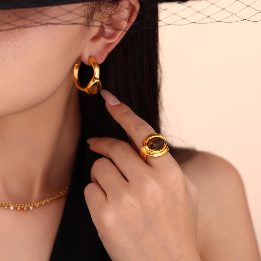 Retro C-Shaped Tiger Eye Stone Earrings & Open Ring Set, Stainless Steel PVD Electroplated Jewelry