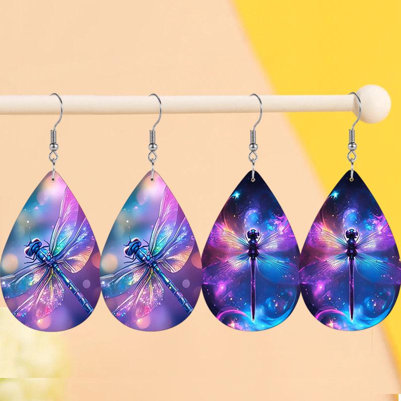 Fantastic Blue Purple Dragonfly Theme PU Earrings for Women, Tropical Style Insect Print Drop Earrings, Women's Fashion Drape Earrings