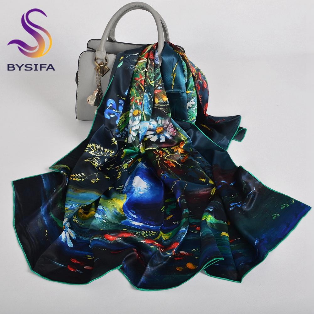 BYSIFA|New Blue Green 100% Silk Shawl Scarf Women Fashion Floral Design Scarves Hijabs Brand Accessories Scarf Wrap Cape 110*110