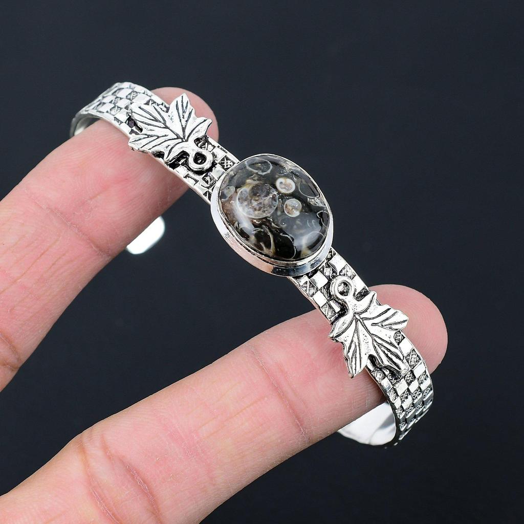 Oval Natural Turritella Agate Engagement Leaf Bangle Jewelry 925 Sterling Silver