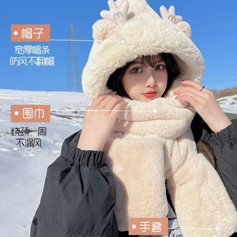 Cute dragon horn bear hat scarf integrated women's winter gloves cycling thickened dragon treasure three-in-one small antler hat