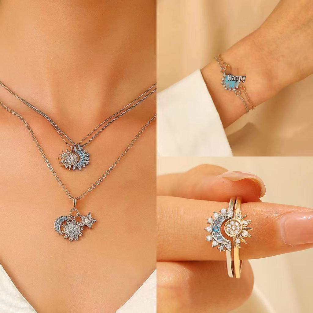 Sun and Moon Diamond Stackable Rings, Necklace, and Bracelet Set - European & American Style
