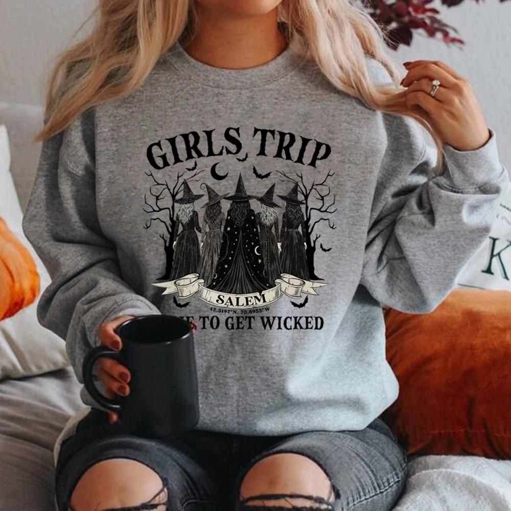 Vintage Girls Trip Salem Sweatshirt Halloween Witch Hoodie Women Crewneck Sweatshirt Salem Witch Hoodie Spooky Season Pullovers