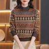 Vintage Knit Sweater Women Winter Semi High Neck Fashion Jacquard Pullover Loose Base Layer Top