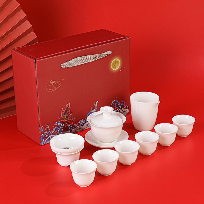 Suet jade tea set gift set creative ten heads white porcelain tea set red gift box commercial gift