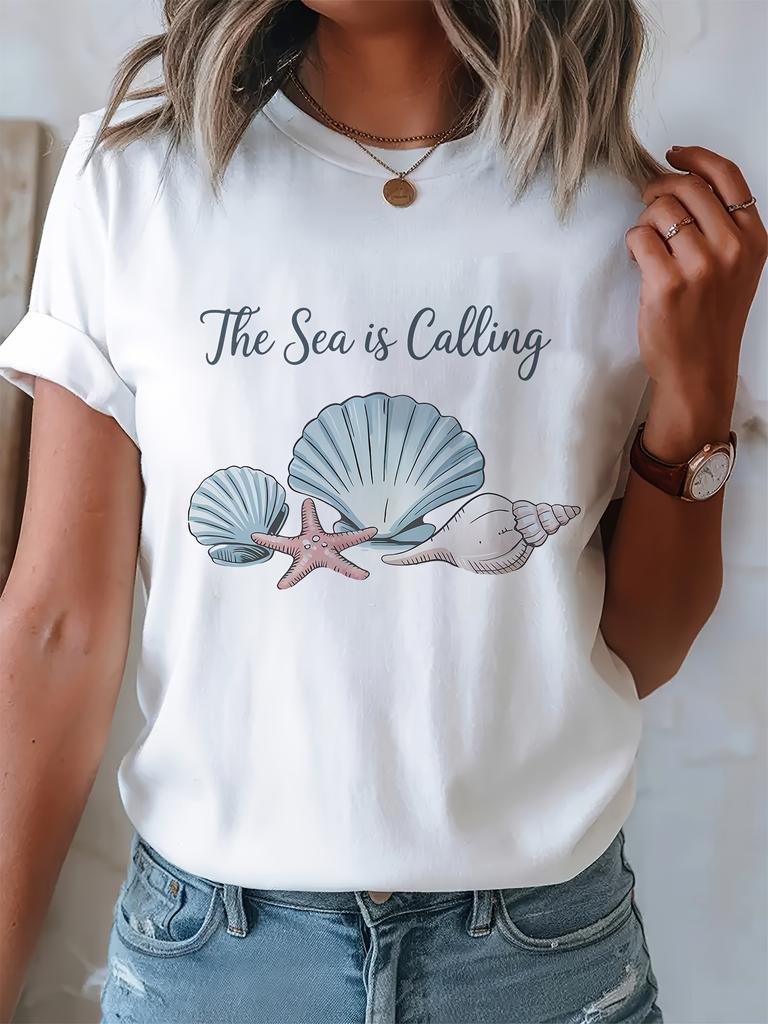 Women's The Sea Is Calling Graphic T-Shirt Seashell Starfish Print Relaxed Fit Round Neck Short Sleeve Top Beach Outings Gifts