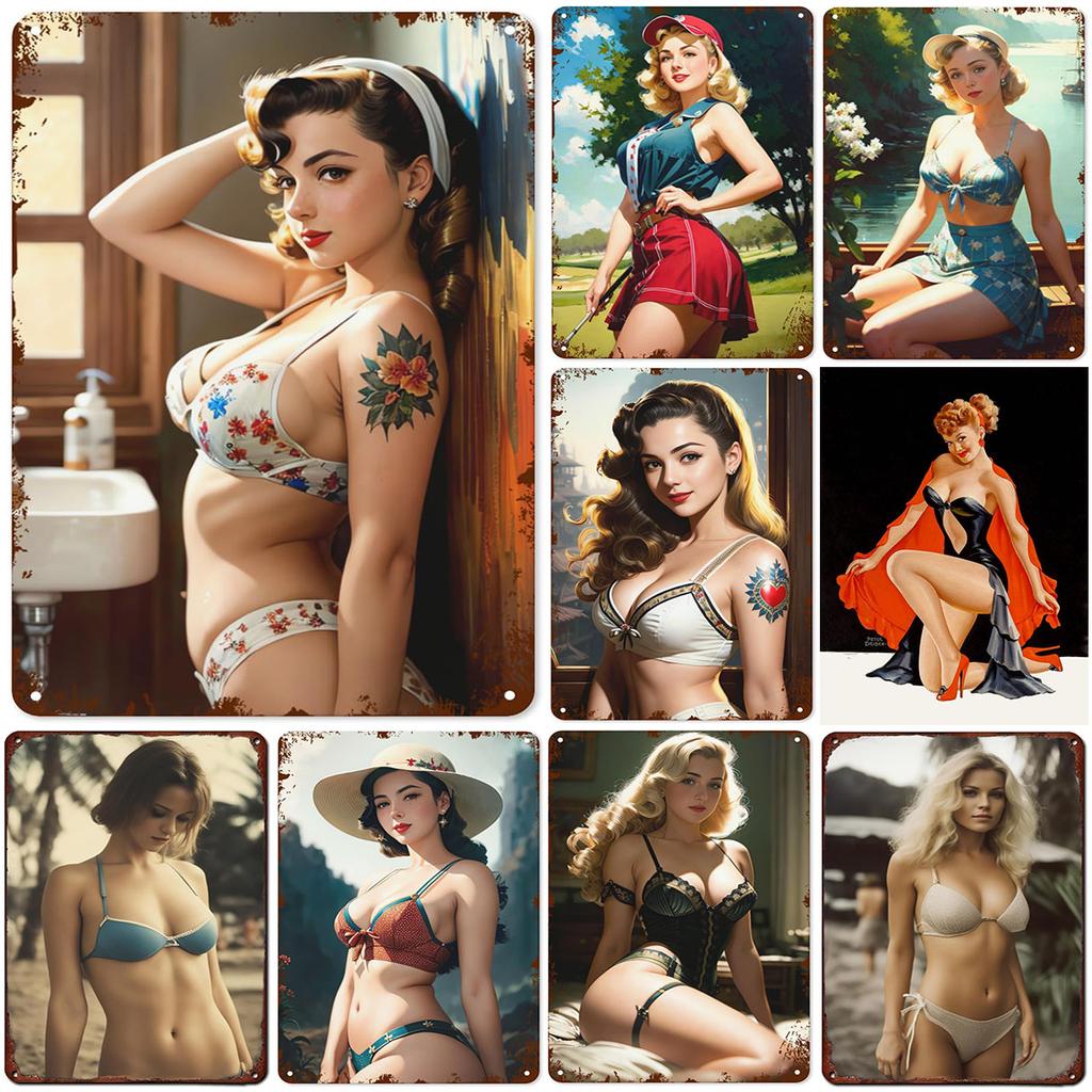 Placas de lata de metal vintage pinup girls sexy mulheres decoração de parede para homem caverna garagem bares café clubes restaurante pôsteres retrô placa