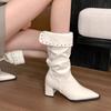 Women's Pointy Pleated Ankle Boots Fashion Square Heels Booties Woman Autumn New Fashion Pu Leather Chunky Heel Knee