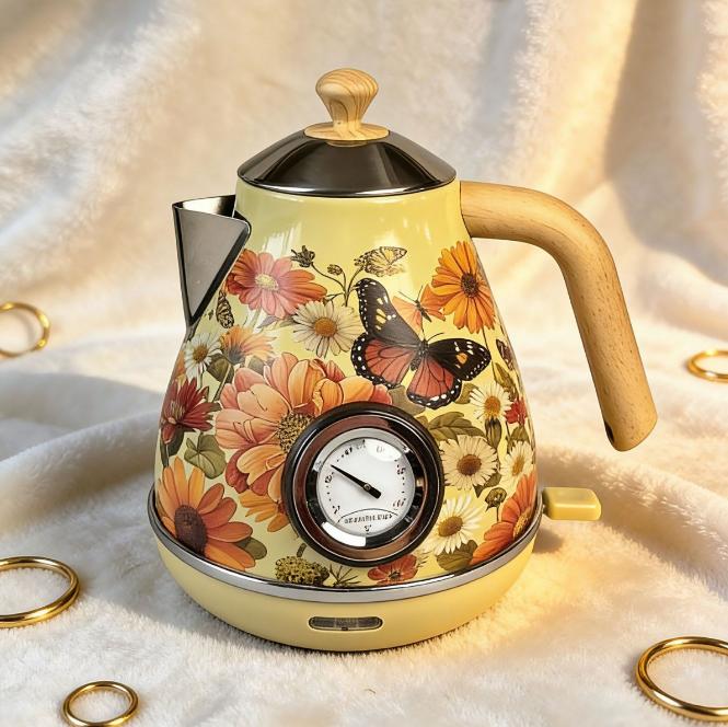 SKU: PS3013Tc Termómetro tipo instrumento chaleira elétrica, chaleira elétrica pintada com marca d'água de flor 1850W aquecedor de água SUS304 lâmpada LED capacidade 1.7L design de saída larga filtro de água pode adicionar design de bico de água alta segurança, fervura rápida sem BPA base com armazenamento de fio fechamento automático e proteção contra fervura a seco