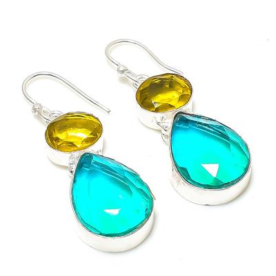 Natural Swiss Blue Topaz, Chalcedony 925 Sterling Silver Earring 2.56" p7U88
